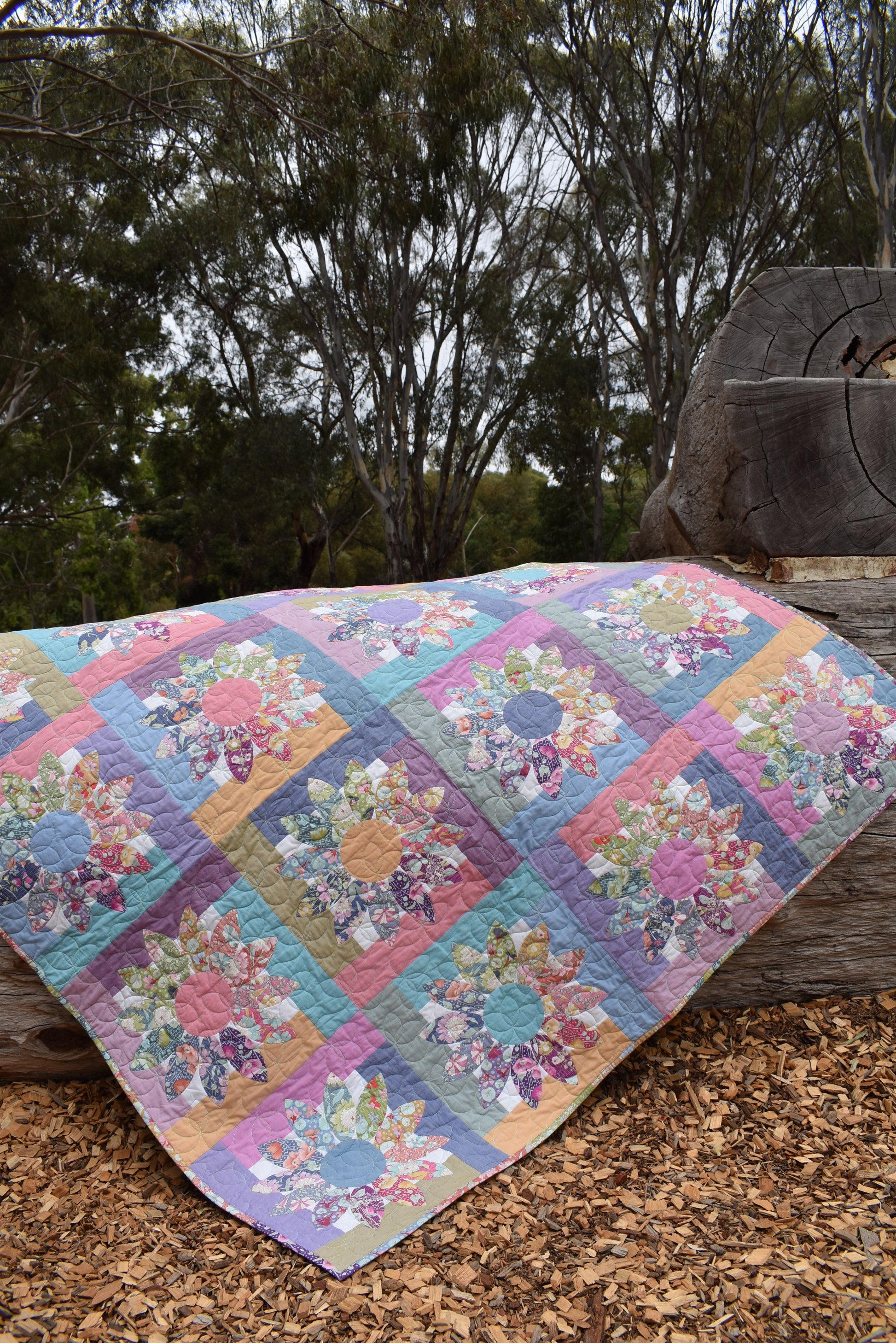 A gorgeous applique flower pattern with plain or pieced petals. Featuring a pieced background block using a collection of stronger tones or keep it soft with low volume neutrals.