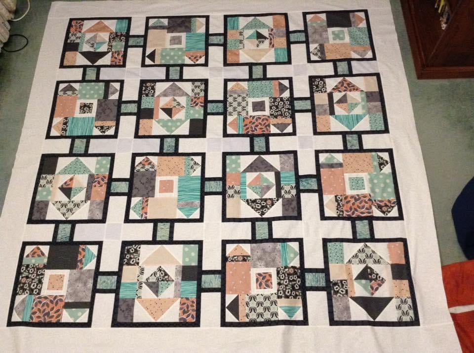 Fun modern quilt using two different easy pieced blocks framed with a narrow border then set with a pieced sashing.